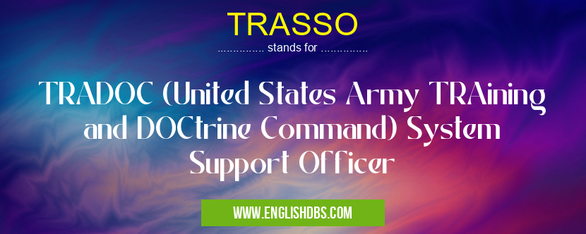 TRASSO mostly used in an acronym Military in Category Governmental that means TRADOC (United States Army TRAining and DOCtrine Command) System Support Officer