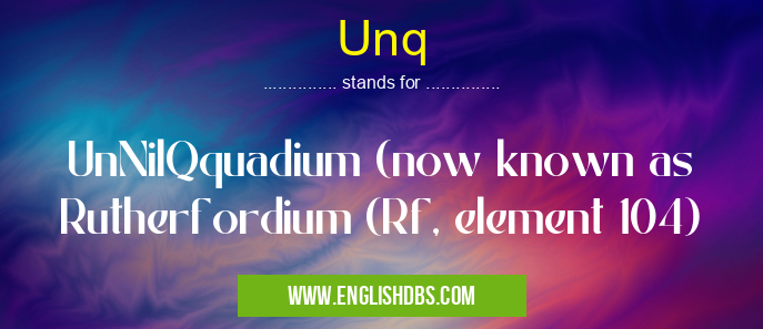 Unq mostly used in an acronym Chemistry in Category Academic & Science that means UnNilQquadium (now known as Rutherfordium (Rf, element 104)