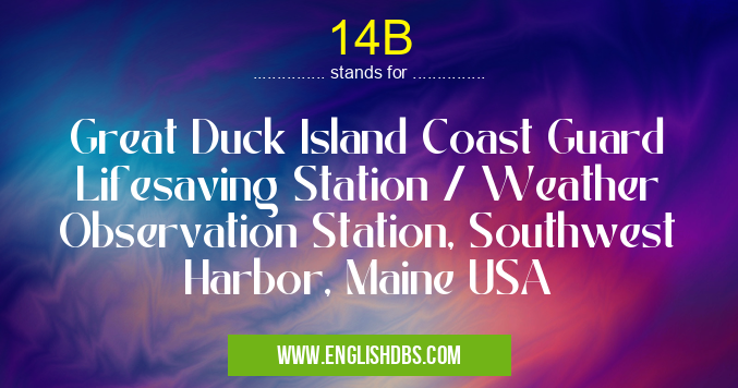 14B mostly used in an acronym Airport Codes in Category Regional that means Great Duck Island Coast Guard Lifesaving Station / Weather Observation Station, Southwest Harbor, Maine USA