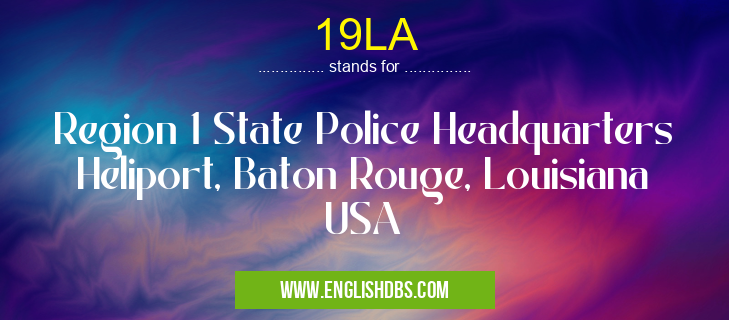 19LA mostly used in an acronym Airport Codes in Category Regional that means Region 1 State Police Headquarters Heliport, Baton Rouge, Louisiana USA