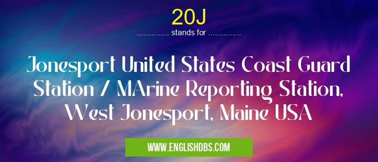 20J mostly used in an acronym Airport Codes in Category Regional that means Jonesport United States Coast Guard Station / MArine Reporting Station, West Jonesport, Maine USA